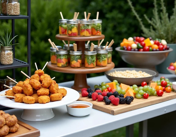 Меню для проведения летнего дня рождения должно быть максимально легким. Не стоит предлагать гостям тяжелые салаты с майонезом или слишком жирные блюда. Пусть угощения будут сочными, низкокалорийными. Рыба, курица, фруктовые и овощные тарелки, сыры, морепродукты и т.д.